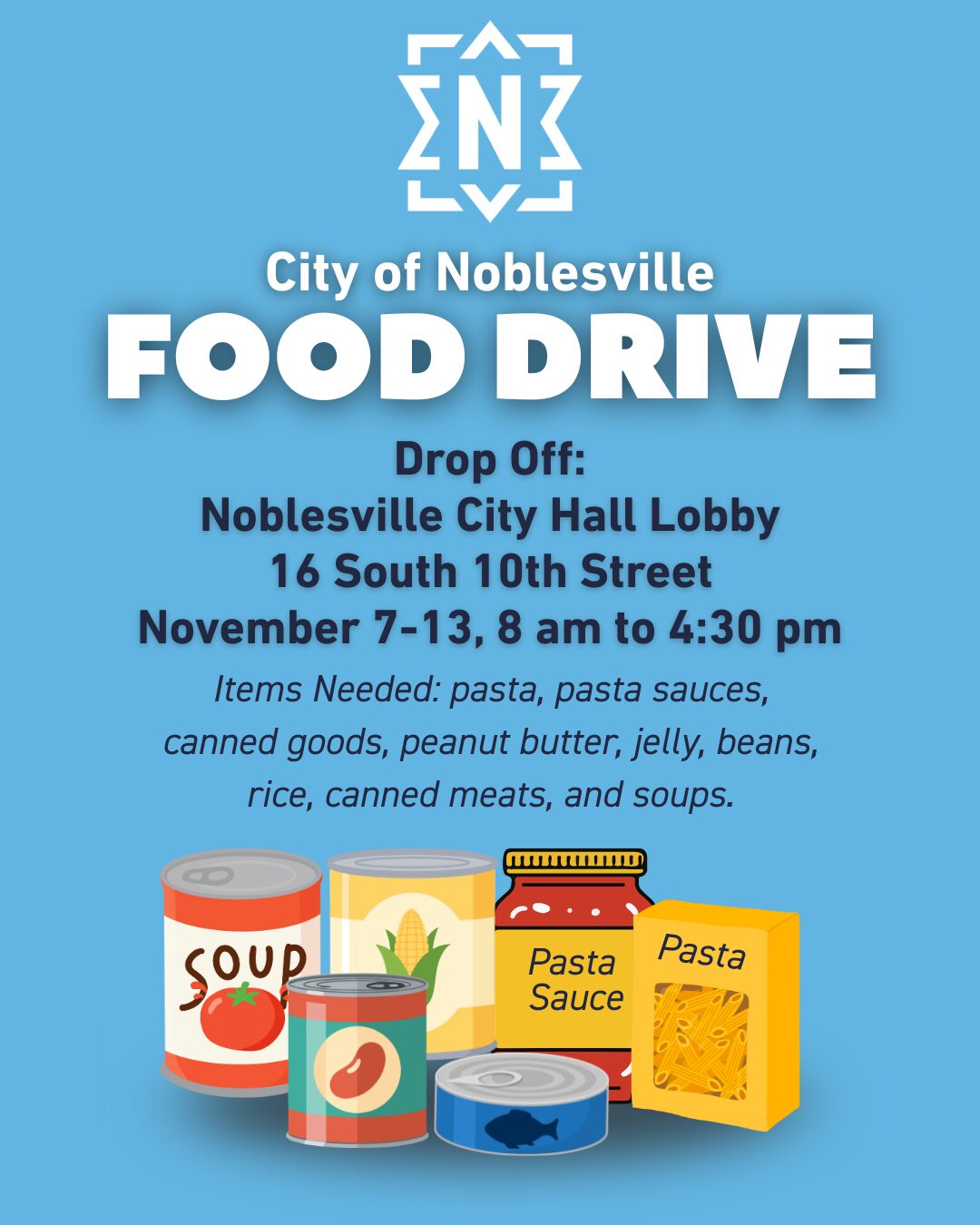 NOBLESVILLE, IN (November 7, 2025) – Noblesville Mayor Chris Jensen announced that due to the federal shutdown, the city will collect non-perishable food items at City Hall, 16 South 10th Street, as a lead into the Noblesville Fire Department’s 48th Annual Food and Toy Drive. Food will be collected at City Hall between Friday, November 7, and Thursday, November 13, between 8:00 a.m. and 4:30 p.m. The food will be donated to the White River Christian Church Food Pantry.